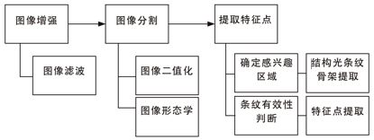 图像处理算法设计是视觉焊接系统中至关重要的环节,其本质就是对视觉传感器采集到的图像信息进行加工,保留有用信息,削弱或者去除噪声干扰。对于搭接焊缝的微小特征识别,本文分别进行图像滤波等一系列处理,处理流程如图2所示。