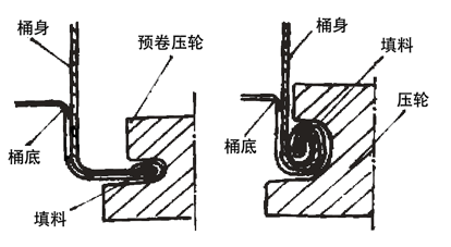 在钢桶制造工艺中,控制选择扳边宽度和扳边夹角;保证缝焊后“丁字口”区域均匀平缓过渡;正确粘贴密封填料位置;增加卷边前整形校正措施和重视卷边压轮设计 及调试是保证钢桶卷边质量的关键和必要的技术措施。