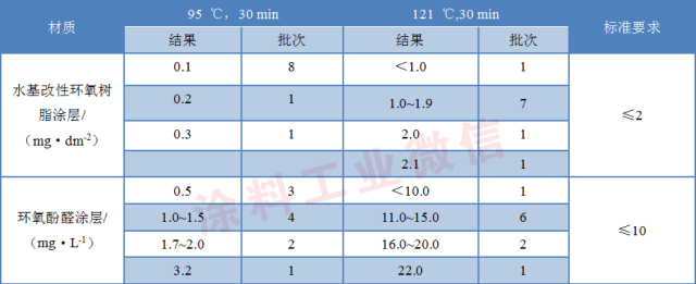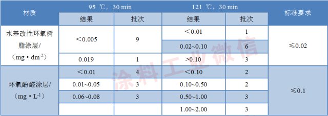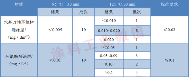 从表3可以看出,游离甲醛的检测项目中,121℃比95℃的检出结果明显高了很多,按95℃,30min进行测定的结果均符合标准要求,而按121℃,30min进行测定的结果,水基改性环氧树脂涂层的有90%大于0.02mg/dm2,若按标准进行判定的话,不合格率则为90%,最高的检测结果为0.125mg/dm2,比标准要求高了6倍;环氧酚醛涂层的有80%结果大于0.1mg/L,最高检测结果为1.92mg/L,比标准要求高了19倍。主要是由于甲醛在热压过程中容易被释放出来,从而对人身体健康造成威胁。