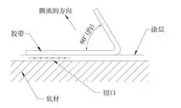 ②在将格子区切屑用软刷或软纸清除后,撕下一段粘附力在(10±1)N/25mm的胶带,将格子区全部覆盖,用手摩擦胶带,确保已完全粘牢后,拿住胶带悬空的一端,并在尽可能接近60°的方向迅速而平稳地将胶带撕下(如图3所示),然后用肉眼观查;