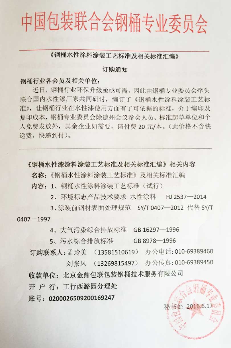 近日,钢桶行业环保升级亟亟可需,因此由钢桶专业委员会牵头联合国内水性漆厂家共同研讨,编订了《钢桶水性涂料涂装工艺标准》,让钢桶行业在水性漆使用方面有了可依据的标准,介于编印及复印成本,钢桶专业委员会除德州会议参会人员、标准起草单位和个人免费发放外,其余企业如需要,请付费20元/本。(此价格不含快递费,快递到付)。