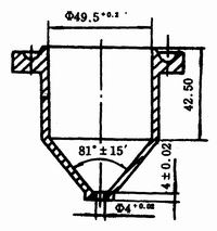 目前,广泛采用流出型粘度计来测定粘度。涂-4粘度计(也称涂-4杯)是应用最广,使用较方便的一种。它可分为台式和便携式两种,它的结构如图,上部为圆柱形,下部为圆锥形,在锥底部有可更换的漏嘴,在容器上部有凹槽,作多余试样溢出时用。