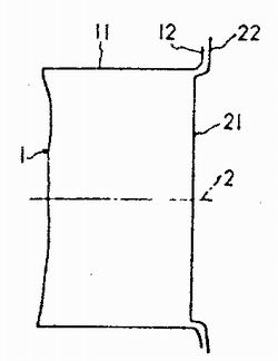 表示在卷边接缝工序的前阶段,圆筒状桶身11上嵌入盆状的顶和底21了的状态。如图所示那样,桶身11的两端部,相对于筒轴2呈直角向外方弯曲,形成法兰120并且,顶和底21的周边部分也沿着桶身法兰12向外弯曲,形成法兰22。