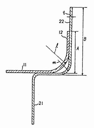 如图所示,12、22的基部被弯成r为L、m的曲率半径,并且顶和底21的法兰22比桶身1 1的法兰要做得长。法兰的长度A、B必须是卷边接合部可卷成三重的长度。法兰基部的r(曲率半径)的尺寸L、m要能适合法兰12、22顺利地进入卷边辊的成型槽中,并能弯曲成型。