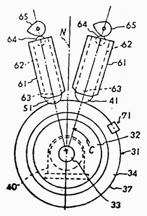 与卷边接缝夹紧装置31接近处设有卷边辊41及端部弯曲整型挤压辊51,两辊41、51沿着圆周方向,分别与垂直的中心线N相隔适当的间距(例如15度夹角)排列着。两辊41、51由套管所引导,在能升降的下压部件62的下部,由轴63支撑着,转动自如,通过桶身及顶和底的卷边接缝部分,随着卷边接缝夹紧装置31的转动而从动转动。升降部件62的顶部被装有能自如的转动的触头辊64,该触头辊64与凸轮65相接触。通过凸轮65的转动,下压部件62就随着升降,卷边辊41及端部弯曲整型挤压辊51就在卷边接缝夹紧装置31的半径方向上运动。