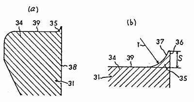 如图所示,卷边接缝夹紧装置31的圆筒成型部34上设有截面形状几乎为三角形的圆角35,圆角35,圆35的一个面36是沿着基准面38延伸的,对应于卷边辊41的导入侧面48(见第五图)。并且圆角35的另外一个面呈圆角斜面下面称圆角斜面37),当卷边辊41与卷边接缝夹紧装置31接近时,对着如第5图所示卷边辊的成形槽42的出侧角46。