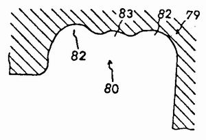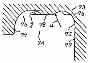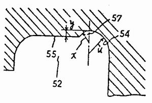 第7图是第6图所示的端部弯曲整型挤压辊成形槽的放大图。成型槽52上第1角部54处设有截面形状做成弓形的凹部570如图所示的那样,它分别与第1角和第2角平滑过度连接。第1角54呈大致1/4圆弧(半径u),第2角呈半径为X的大致1/6圆弧;凹部57的深度为Y。