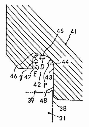 卷边辊41沿着圆周有成形槽42。成形槽42几乎呈D型,朝着卷边接缝夹紧装置31的成形面39开口。从成型槽42的进入侧面43(法兰进入的一侧,图面来说是右侧面)到第1角部44的截面几乎呈四分之一的圆弧。槽底45与第1角部44相连,呈直线形状。与槽底相连的第2角部46的曲率半径小于第1角部44的曲率半径,也呈1/4圆弧。与第2角部46连加的出口侧侧面47呈直线形状。导入面48由进入侧侧面43向下方延伸,对进入到成型槽42来的法兰12、22进行引导。