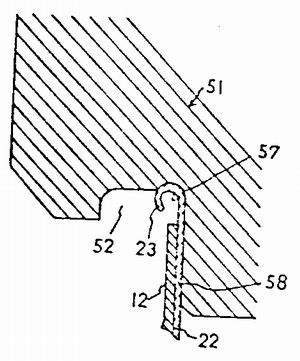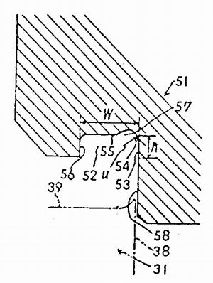 第6图是端部弯曲整型挤压辊的截面图它能将卷边接缝部的截面形状整形成几乎呈长方形。端部弯曲整型挤压辊51沿着圆周方向设有成形槽52,它几乎呈长方形,向着卷边接缝夹紧装置31的成形面39开有口子。成型槽52的第1角54及第2角56几乎呈1/4圆弧。并且,成型槽52的深度n是卷边接合部厚度的1/2,而它的宽度W则与卷边接合部的高度相同。