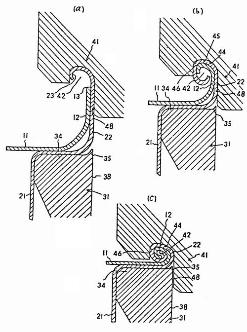 第9图(a),第9(b),第9图(c)分别表示卷边接缝的初级阶段、中间阶段,结束阶段。