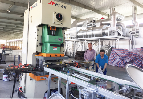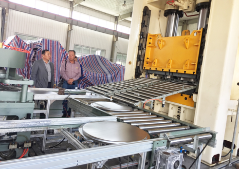 按照通知精神,钢桶生产线是开不起来了,但配套线还可以生产,所以我们又看到了他的创新,目前他为了印铁时钢板无油,新上了擦板机。为了降低生产成本和噪声及职工的劳动强度,对底盖冲压线进行了改造和更新,采用落片冲裁-堆码-拆垛-液压拉伸桶顶底(无噪声)-自动输送-预卷-冲铆桶口法兰。落片冲压桶底顶,解决了整张印涂铁冲压后,下角料无法回收的问题。