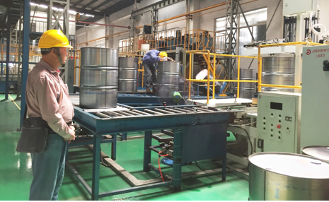 目前四方正在按照中央精神,撸起袖子准备大干,他们已经完成了太仓工厂生产线的改造,改造后的钢桶生产线自动化程度很高。生产线上采用了桶底顶错位冲压后自动预卷烘干、堆垛、输送、拆垛、自动上盖。后段采用自动寻缝、自动检漏、然后自动粘标、喷涂、撕标、寻桶口、废气置换、充干燥气体、自动上口盖等。我们紧接着参观了四方太仓工厂。